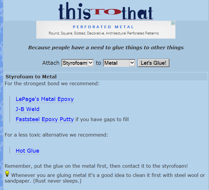 First, I asked it what I should use to glue Styrofoam to metal. It answered with its recommendations and a bit of helpful advice to go with: