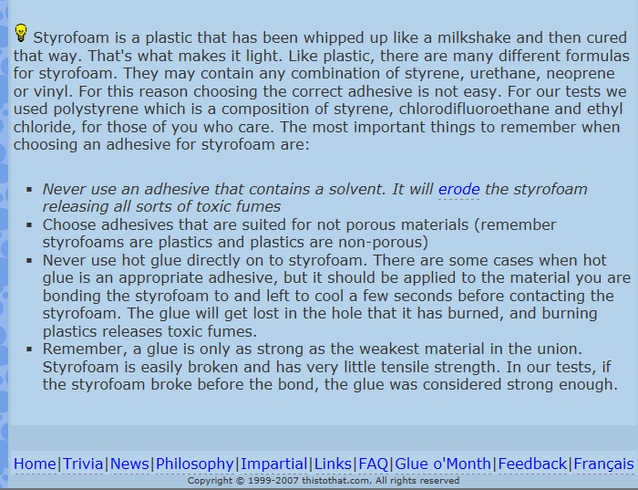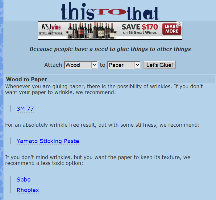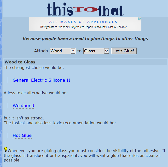 The online calculator (of all sorts) is one of the innovations of the cyber-age that makes me wonder what we did, you know, BEFORE. My latest discovery is the site This to That, which comes to your rescue when you want to glue one material to another and you need to know which adhesive to use.
