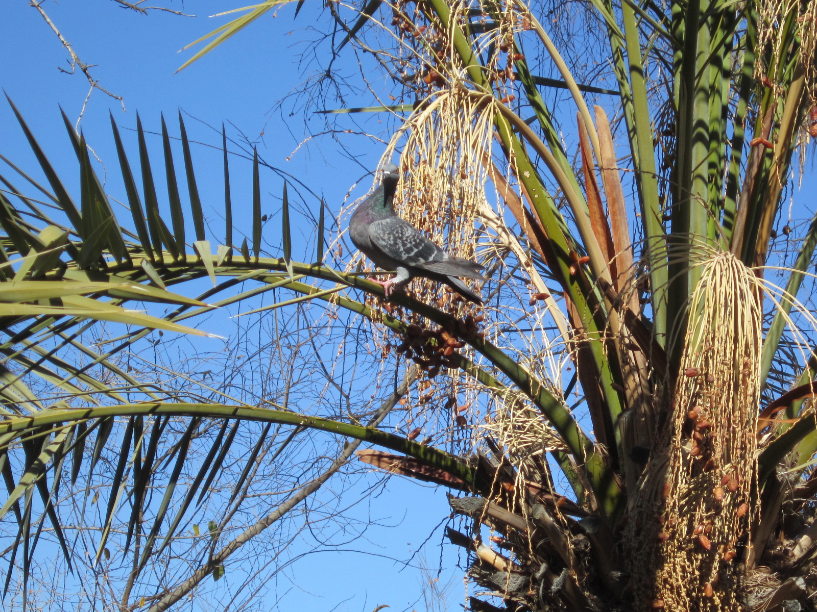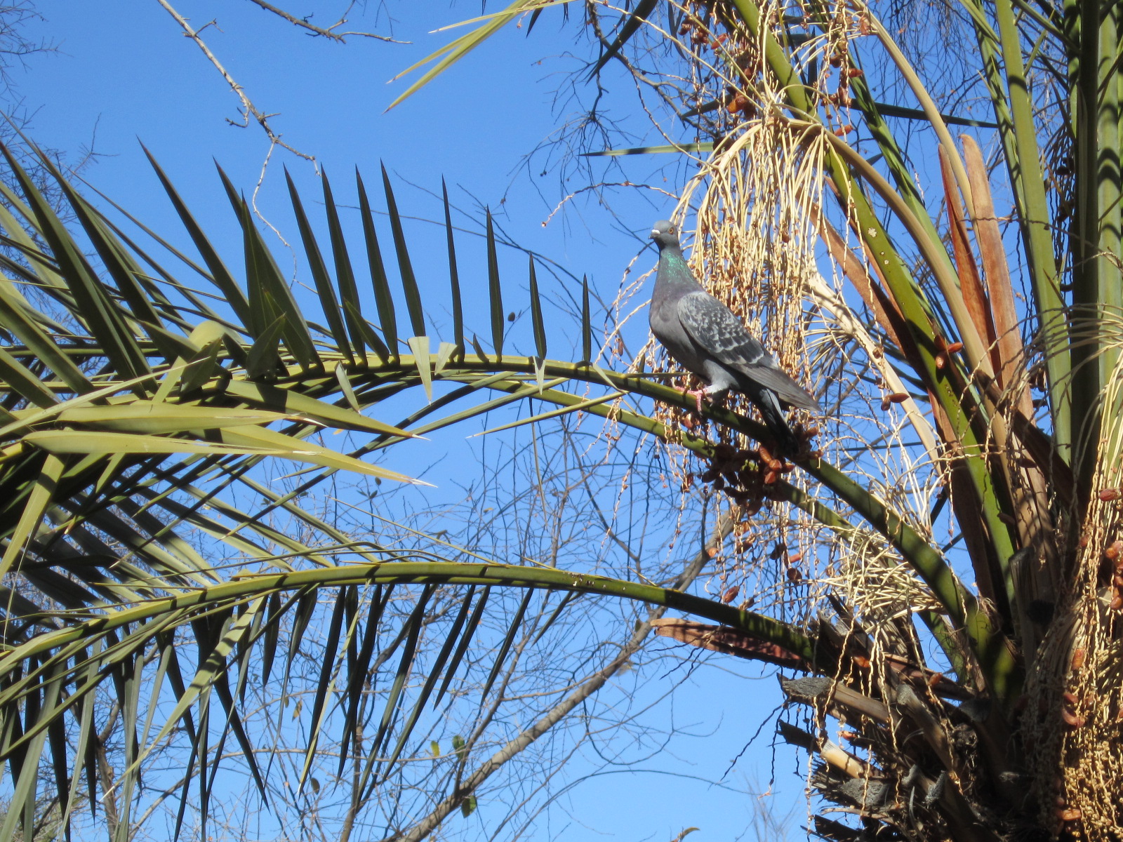 For one thing, his usual stances and postures are replaced by those typical of any other bird in a tree… a bird delicately positioned on a limb (in this case, a frond, as the tree is a Phoenix date palm) instead of standing solid on the ground. I think that’s another reason why it took a minute to realize that he was a pigeon… he held himself differently, perching, balancing, being… un-pigeon-like. Rather than doing the urban pigeon-walk, he hopped lightly and fluttered, and because his movements were different, his colors flashed in the sunlight differently, too. I’ve always found pigeons to be beautiful, but now I could appreciate his beauty in a whole new way.