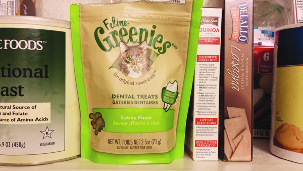 The boys wanted to contribute to the list! They learned to identify this little bag of catnip-flavored treats immediately. It’s their new addiction. It’s like… pot brownies for kitties.