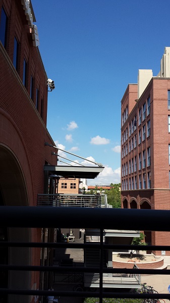 Outside of the conversation, the soundscape featured the periodic splashing of a waterfall on asphalt, and airplanes cruising overhead, descending for landing every five minutes or so. More distant, the sound of people talking and music playing filled in the void that asked for white noise.