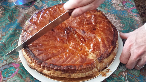 Galette des Rois… actually, a “Pithivier,” according to Callaghan. The traditional King’s Cakes are this, but thinner… quite different from the King Cakes Americans have at Mardi Gras.