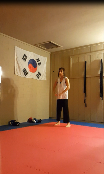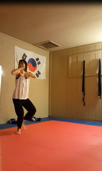 So, with this new phone camera, thinking of how I could show what the space can accommodate, I decided to record myself doing a Tae Kwan Do form (hyung in Korean; kata in Japanese – this is TKD, so it’s hyung). I recorded the video on Sunday afternoon and used “pause” and “the snippy tool” to get the slew of Tae Kwan Do technique selfies posted here.