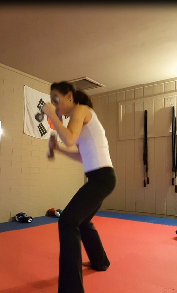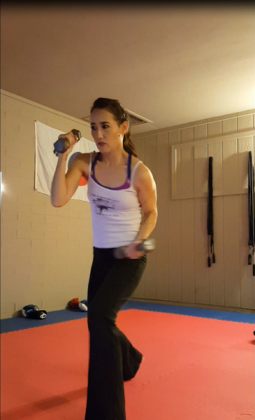 Here I’m doing what I’d said wouldn’t suffice for my strength-training goals – shadow-boxing with weights. It’s actually great if I do it regularly as a component of a complete workout. These are five-pound dumbbells.