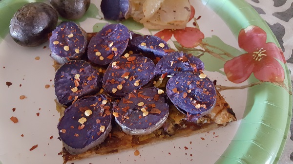 I came up with this combination as an inside joke with Callaghan. It’s just two things: Amy’s roasted vegetable no cheese pizza, and roasted, sliced potatoes on top. (I use Peruvian potatoes. SO GOOD.) It’s currently our favorite way to eat pizza.