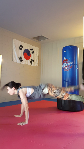 A traditional burpee involves doing a push-up from plank position. In the variation I did, the push-up is replaced with a sprawl. Rather than kicking back into plank and doing a push-up, you kick back and land with your hips down on the mat in one fluid motion. The sprawl is a technique done to defend against a shoot, which is a take-down attempt.