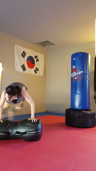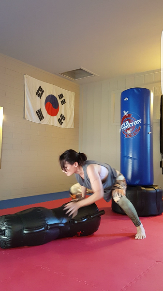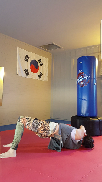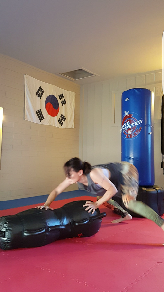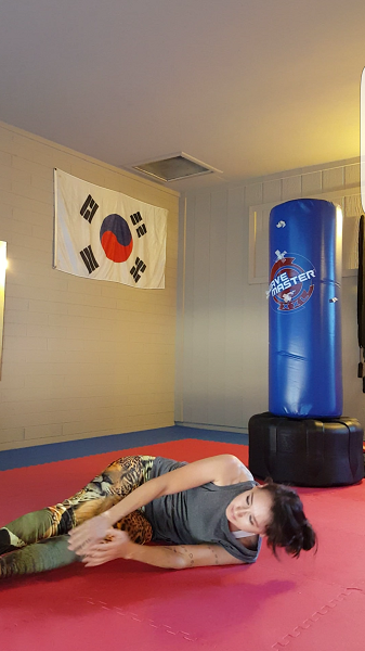 –I did a few sets of shoulder rolls across the floor somewhere in here, but I didn’t capture pics of them. It’s difficult capturing shoulder roll (or any kind of roll) pics that show anything… with a cell phone camera, at least.
