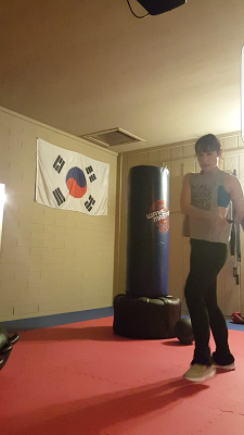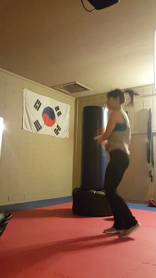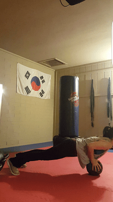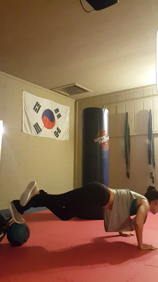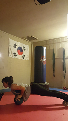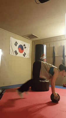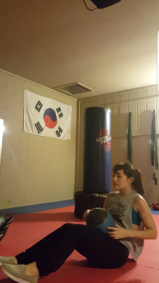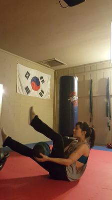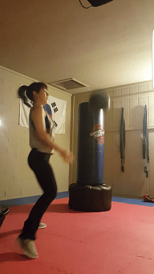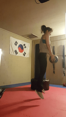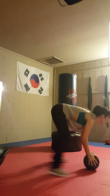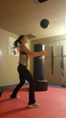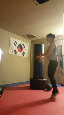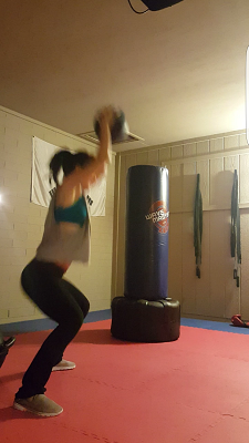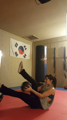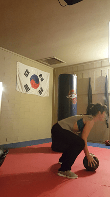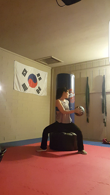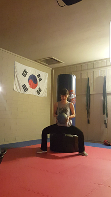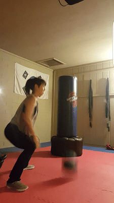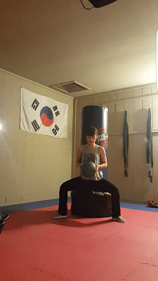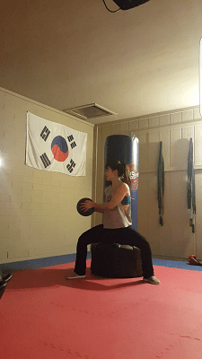 Here, I’m leaning on the bag, but I’m not sitting on the base. This exercise strengthens the core (with emphasis on the leg part of the core as well as on the obliques), and it’s usually done against a wall. Using the round punching bag instead allows for more of a stretch, but I only twist as far as I comfortably can while maintaining my stance.