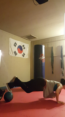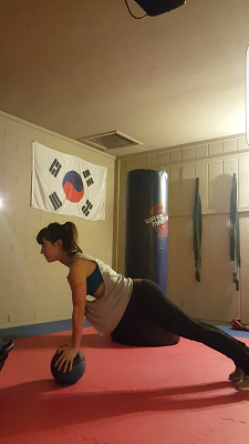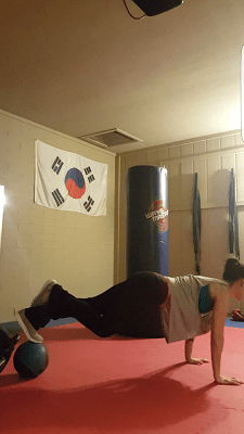 I did both incline and decline push-ups on the medicine ball. Both ways are challenging, but the decline ones are killer: you need all of your core strength to balance in the push-up position and do the push-up with your toes on the ball instead of on the floor. I did them with both feet, then one-legged. I take my time with these push-ups. I have to. It’s not easy balancing on the small, unstable ball!