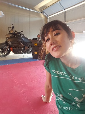 We gave up on keeping the mat in the garage dust-free. Let’s be real: this is Arizona, where your interior abode gets dusty quickly no matter what you do. A dust-free garage in the desert? Not going to happen. It was a losing battle, especially since we don’t have a lot of time, so we finally bought some cheap, light, and flexible slip-on shoes, which we wear only on the mat. We do sweep the mat and clean it every once in a while, but in between cleanings, footwear is a must.