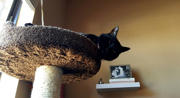 Cita was happy and relaxed, as playful and affectionate as ever. We spent most of our time with her in her “apartment,” which she loved. She had her favorite scratch pads from the patio, all of her toys, including her precious salamander; she had multiple bedding areas and surfaces to climb. She had houseplants and her cat tree by the window, and she loved sitting on the highest level, enjoying the spring breeze through the screen and watching the birds.