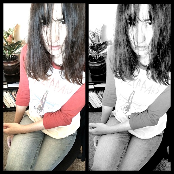 Callaghan said that I look like a teenage boy in this pic, and I guess I can see it. I’m ragged and bare-faced, and my hair is a casualty of my indecision dragging itself out. (I can’t decide what I want to say when I go to get my hair cut, so I just haven’t gone to get it cut.) Then, of course, I filtered the image to make it look even more terrible, because why not. This is the opposite of the way you normally see me. This is my grungy Gen-X writer’s self-portrait.