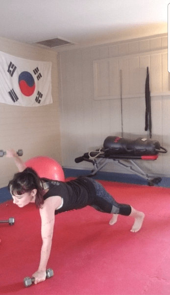 I actually felt this one destroying my abs as I was doing it. I used 5 lb weights, and while they were light for the shoulder-work, itself, the fact that you’re stabilizing yourself with your body set up like a lopsided tripod makes it a killer core workout.