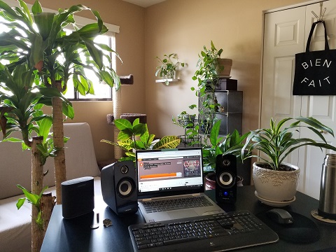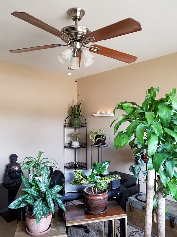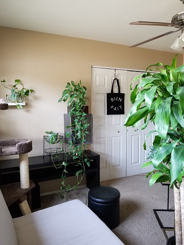 Looking toward my desk from the window wall, you can see eight of the 11 plants, including Flamingo (the potted tree on the right).
