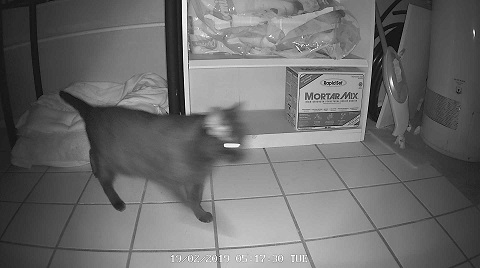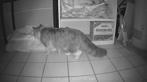 We witnessed the spraying disservice to Salem after the fact. Our cat cam captured the whole thing, starting with the criminal cat entering the laundry room at 1:57am. Check him out in this still: