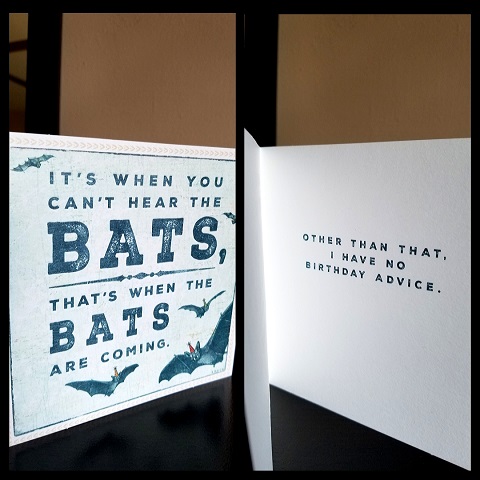 You guys, this was a totally random and anti-minimalism purchase. I was looking for a card for a specific person/occasion – not a birthday – and my eye snagged on this one. Bats! I read the outside, read the inside, and felt an uplifting of mirth such that there was no way my depression-challenged ass wasn’t going to bring it home. I love the art, as I said, but the card had me at the incorrect comma, weird/wrong syntax, and the awesome WTF-ness of the punchline. This card with its goofy message and birthday-hat-wearing-bats sits on my dresser and makes me giggle every day. Best four bucks spent in the month of March.
