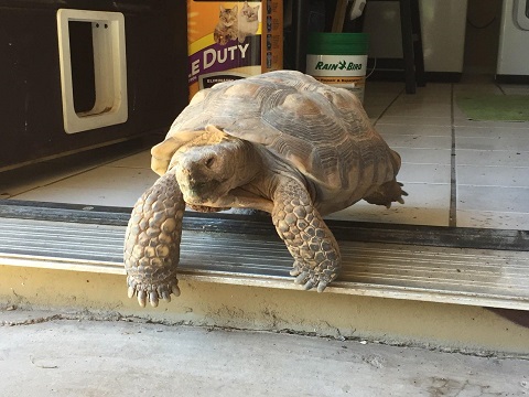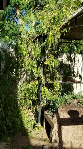 He sleeps through everything, including theatrics such as yesterday’s: a micro-burst hit our neighborhood and felled our neighbors’ mesquite tree, the broken part of which ended up partially on the pavilion covering Geronimo’s burrow.