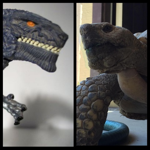 It occurred to me recently that our sweet, funny little dinosaur looked familiar. He reminded me of someone famous, an idea that became a matter worthy of serious investigation. Geronimo has a celebrity doppelganger! I must find out who! An image came to mind, and from that, a suspicion. I dug around online and confirmed it. Either Godzilla (1998) was deliberately created in the likeness of Geronimo’s kind, or the likeness was a coincidence. It’s that distinct shape of the face… the nose, the chin, the slope of the mouth, nearly everything!