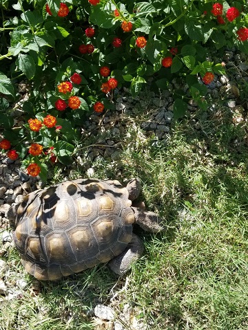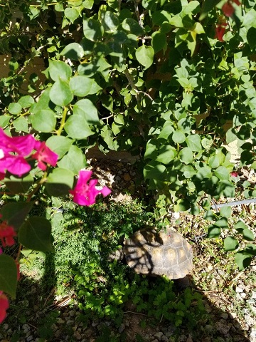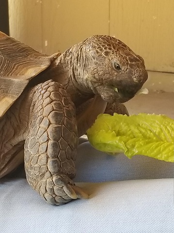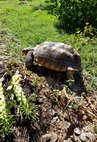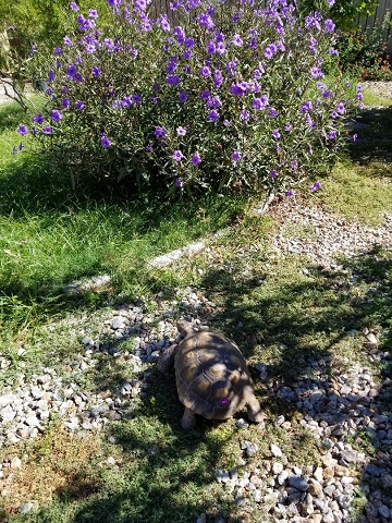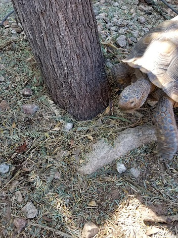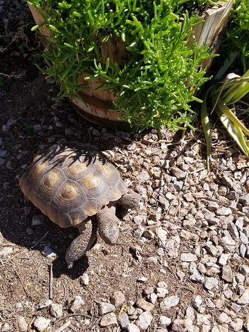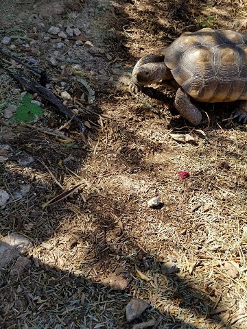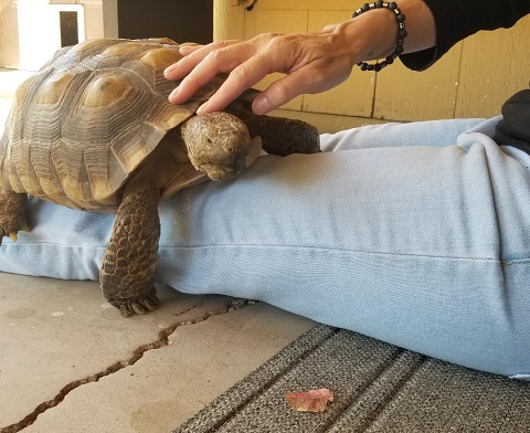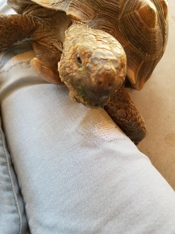 Geronimo did his Geronimo thing and charmed everyone. He easily bewitched Doctor R., who was again impressed with his personable and affectionate nature. She noted how he asked us to pet his head, nose, and neck, leaning into our hands and stretching his neck from one side to the other to get equal attention on both sides. According to her, many desert tortoises don’t care to be touched at all. “They’ll pull their heads in when you go to touch them,” she said. “You must spend a lot of time with Geronimo.” We do, indeed, not to mention AGAIN that we really bonded with the little guy when we had to keep him indoors, entertained, and out of trouble during hibernation season that first year. Last year. Yeah, that was a lot of bonding.
