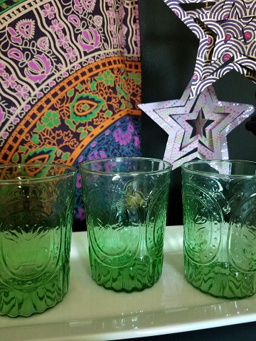 Anyway, I have pics. I know you want to see them. (Heheh.) I took these in my office against the aforementioned black wall, even though none of these items belong in here. I’ve got the throw pillow with its new cover out in the laundry room along with the origami star ornaments, and three of the green glass tumblers are in the kitchen cabinet. The fourth one is in my bathroom.