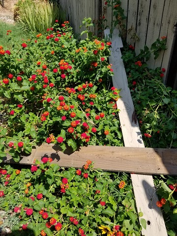 What else? A section of the fence separating our yard from the neighbors’ broke and fell during the storm. I investigated the damage and found the fence boards lying over the verbena (or lantana?), nails up. At least there’s no danger of Geronimo climbing over them. I have to figure out what to do about the situation, though.