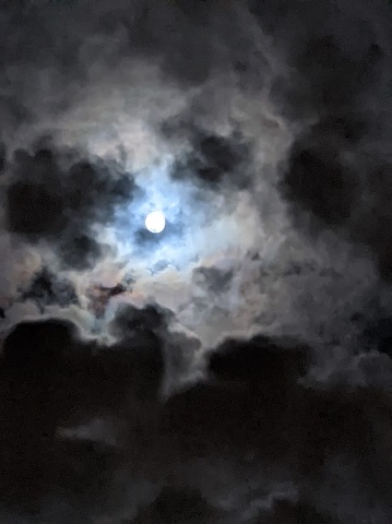 Of course I went outside and tried to take pics of the moon with my cell phone! There was a cloud cover that obscured it, but my phone is a Google Pixel, so I got some pics that I like nonetheless. This pic is raw and untouched, as usual: