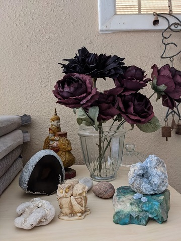 This brings us to the room, itself. Its aesthetic? Well, I’ve filled it with old furniture and old treasures, found treasures. A dusty candle last lit over a decade ago, fake dead flowers, natural objects I’d picked up in nature – hiking trails, beaches, backyards – with every intention of keeping them forever. Crystals, an antique doll handed down to me, re-homed tapestries, a few garish cast-offs. It’s kind of witchy and celestial and grimy in there. You might decide that it’s cottagegoth or goblincore. I’m still adding to it; I have the ashes of several beloved furbabies in their wooden urns waiting to be arranged in the shrine to them that I’m going to make.