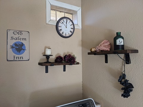 Dryer corner: a clock sent to me by mistake, more fake dead flowers, a dusty old candle, an antique doll handed down to me, the green bats’ blood bottle I had in my office during its dark academia iteration.