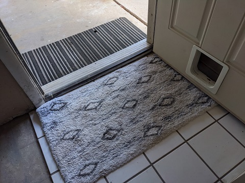 Salem’s doormat and rug. This is the old rug that’s really dramatically out of place when I go in every day. It’s pushed aside, bunched or folded. Sometimes, I find it in the middle of the room. Often, I find one or two of Salem’s toys where the mat should be. They tell the whole story.