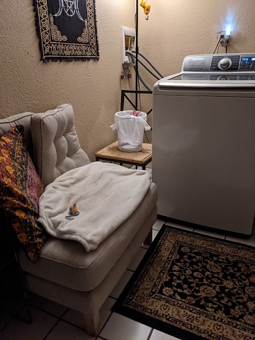 Salem’s toy area beneath the laundry table. She used to sleep in this space. By the time I moved the ottoman in, she was brave and comfortable enough to choose it for her new bed. It started to get chilly at night soon after I realized that she was sleeping on the ottoman, so I put her blanket there instead of down here. Most of these toys are scattered throughout the room when I come in during the day.