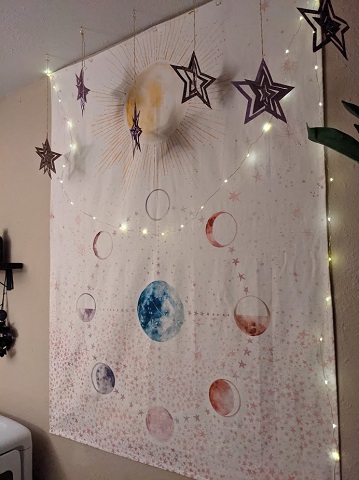 My celestial tapestry on the long wall, with faerie lights and glittery, jewel-toned paper origami stars.