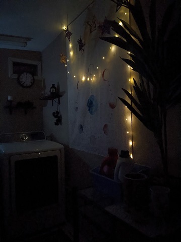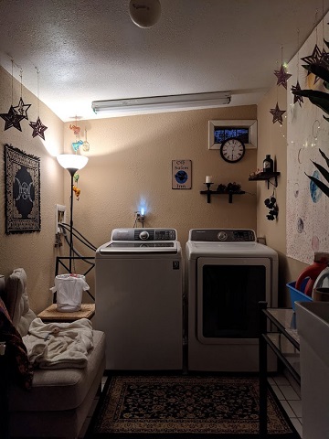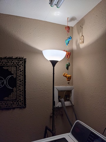 Washing machine corner: an old floor lamp, a string of cloth elephants from an Etsy shop in India (which I got to replace my cherished elephant string that I’d lost), a small handmade plaque I’d purchased in a ghost town.