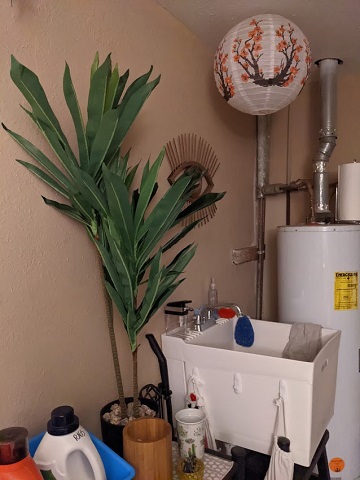 Water heater corner (to the right of the door): the water heater, of course, and the utility sink. Above the sink, a cast-off sakura paper lantern, a small round mirror in a wooden frame in the shape of an eye. Next to it, my little glass and wrought iron table from 20 or so years ago that now holds my laundry detergents, a fake tree, and random objects.