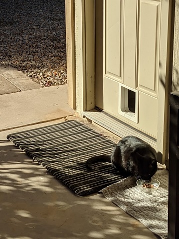 Going out isn’t the norm for her anymore. Staying here is. She loves her yard, her patio, her room. In the morning, she comes out to eat her breakfast, and then she goes back in. I’ve noticed on the weekends that she sometimes stays in the laundry room well into the afternoon.