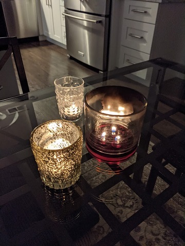 Fall cleaning took place today, finally, and now my freshened house smells like sweet, warm spices and apple cider. It’s been years since I’ve been much of a candle person; I cycled back around to candles this season. Currently I’ve got a “pumpkin muffins” soy candle burning on my dining table, along with a couple of tea lights.