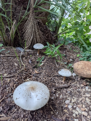 This year we’ve been blessed with a spectacular magical monsoon in our spectacular magical desert! This monsoon’s brought us the thunderstorms and rainfall we’ve missed in recent summers past, and it’s been fantastic. We had that intense heat wave in June, right around the time other states had theirs (I’m thinking of 119 in Portland, where many people don’t have A/C), but the temps dropped to classic monsoon lows almost as soon as July got underway. We’ve had cool temperatures ranging from the mid-90’s to mid-100s, we’ve enjoyed frequent storm activity (thunder! lightning! strong winds! RAIN!), and yesterday, my friends, I discovered mushrooms growing near the date palm in my front yard.