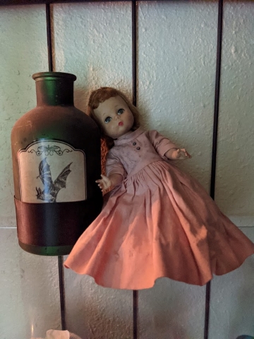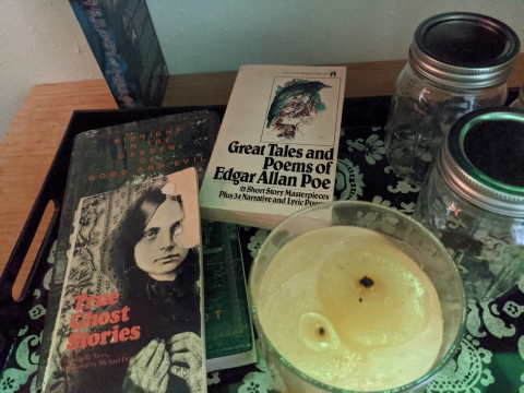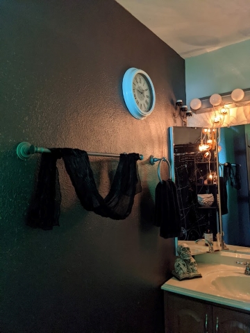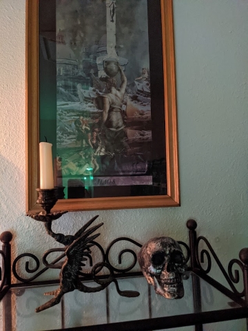 This year, I decided to transform the room in the spirit of spooky season, and what a joyous undertaking it was! I ran around the house choosing what I wanted to put in there. I have spooky things all over the place, including some items that were still in my closet. It was a super fun decorating project because I didn’t have to buy anything or otherwise wait for anything to arrive. It was just a gathering of things.