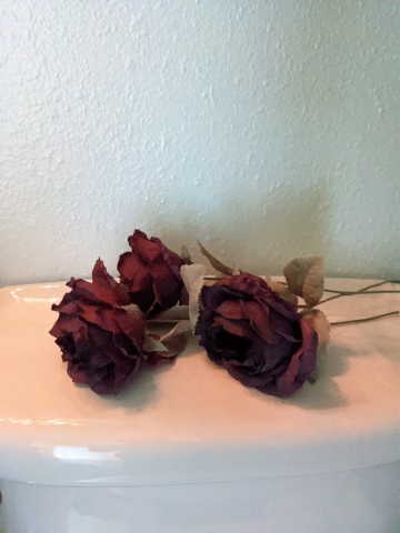 The hallway bathroom, my friends, is in dire need of renovation. For one thing, I would like to be able to soak in the tub. The bathtub/shower is old. Flakes of rust pollute the water when it’s run for a bath, and the glass doors are stained with soap and hard water from years of neglect before I bought the house. I’ve tried to clean them, but they always look gross. I suppose I could spend a whole day with a bottle of chemicals, but… nah. Instead, I slapped a dowel up there and hung a shower curtain to hide it.