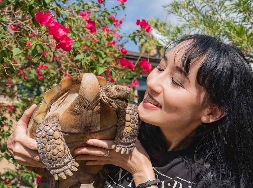 This next pic is kind of strange and wonderful. We were trying to get my face closer to Geronimo’s, so my head was tilted down toward him as I tilted him up toward me, and the result is Geronimo looking like a cobra with his face appearing at the top of his under-shell. You can also see what a wide Humvee of a guy he is. My knees fit beneath him with his legs on either side. Haha!