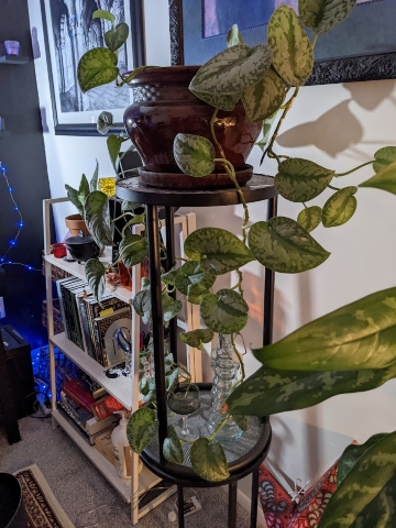 So I moved half of my office out into the hallway, as I was going to bring in an area rug. There wasn’t too much stuff to move, but it all wound up in the scant hallway space – awkwardly, might I add. Last to be hauled out was my plant Holder, who roosts on a stand, which, for some reason, I decided to keep him on as I removed them both from the room.