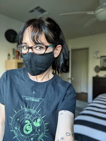 Though I do own a few fancy masks, my everyday mask uniform is basic black. I have 16 of them, all the same.