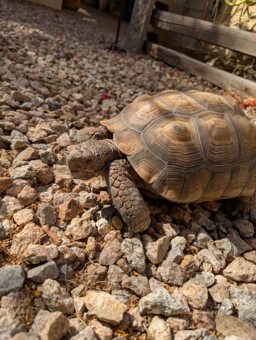 Reptile kid (Geronimo) vacillates on the line between hibernating and not-hibernating. A desert tortoise will do this; it’s just challenging when you have him artificially hibernating in a Sterilite box in the tool shed. It was 76F today, so I took him out – with great ceremony, mind you – and placed him in the sun to bask.