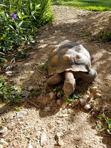 By mid-April, he was out and cruising the perimeter of his yard, eating everything in sight, it seemed. He ate wild grasses, a variety of young spring weeds, hibiscus buds on the ground, and hibiscus flowers from my hand. As far as he was concerned, it was a smorgasbord for all of the divine in the Universe!