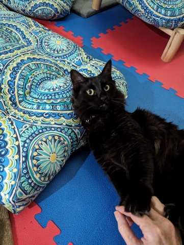 Everything was fine, except that he kept getting between my feet as he tried to push his way between me and the washing machine, causing me to stumble and almost trip as I wanted to avoid stepping on him. When he wasn’t between my feet, he was repeatedly folding the large rug back from the corner – or, more accurately, he was bulldozing it back – because he wanted to sit on the tile beneath it.
