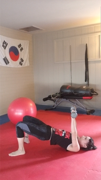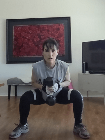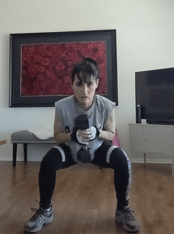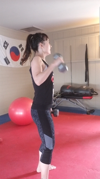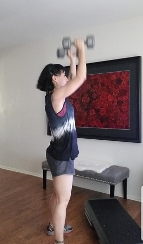 Body Pump’s approach is an hour of light weights, high reps, and very little rest. These dumbbells are adjustable, and here I have them set at 15 lbs. It’s a good weight for the millions of reps that we do during the fast-paced 5-7 minute back workout.