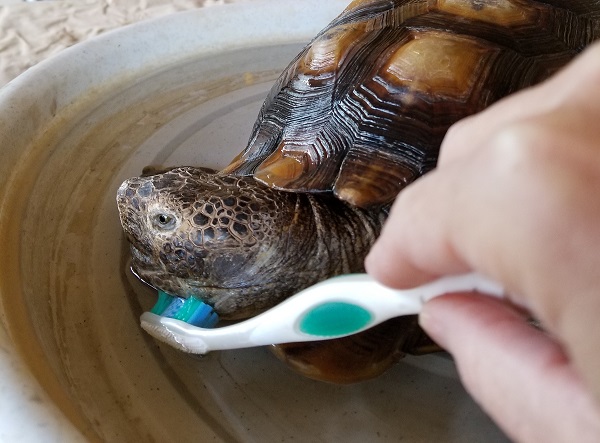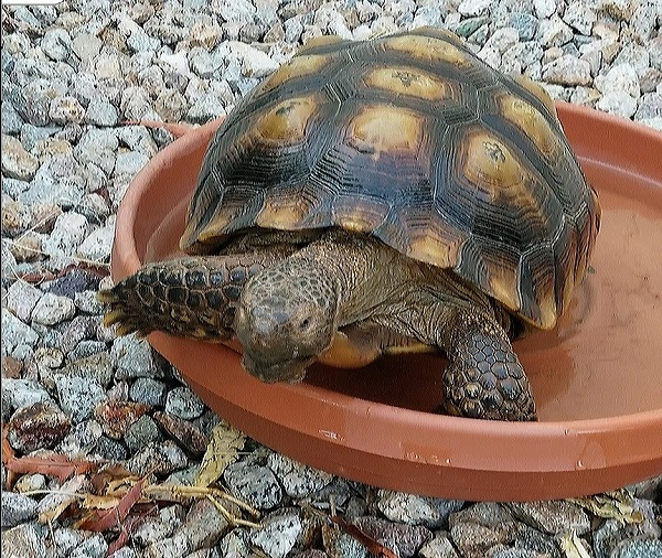 The fabric was caught in the crevice under his chin where his under-shell connects to his body, wedged so deeply in there that I had to tug and pull with effort to extricate it. Long, heavy, weighed down with dirt, and jammed into that space around his neck? He could only have gotten himself tangled up in it in the depths of his burrow… and that explained why I hadn’t seen him for almost three weeks. It was the force of his innate desert-tortoise need to be in the rain that saved him, I believe. The call of the storm aroused his will to live, and somehow (the vet was amazed) he managed to turn himself around down there in that cramped space with that thing attached to him.
