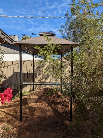 As well, we purchased a new pavilion for the burrow to help shade it, as the old one was trashed. Vidal helped with that, too! He followed us to Lowe’s to pick up the pavilion, and the three of us put it together.