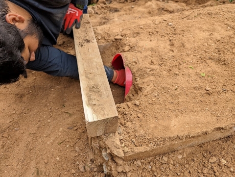 After filling in and packing down the caved-in back part of the burrow, Vidal set the conjoined buckets inside the old burrow’s existing external structure. In accordance with the instructions, he measured the depth of the back end to make sure that it would be 16 inches deep. The buckets had to slope down at a 20-degree angle.