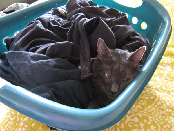 I don’t think he had any motive beyond demonstrating his ability to sort himself into the appropriate laundry pile… I mean, I don’t think he was trying to get out or to gain free admission to a thrilling ride in the washing machine or anything like that. He loves it here in the apartment, and he’s very good at bathing himself. He needs neither to escape nor to submit himself to the rigors of an industrial cleansing. No, it’s clear from the expression on his face that he’s just satisfied with his own analytical abilities. Bet you can’t find me, Mommy!