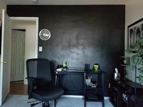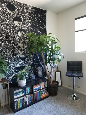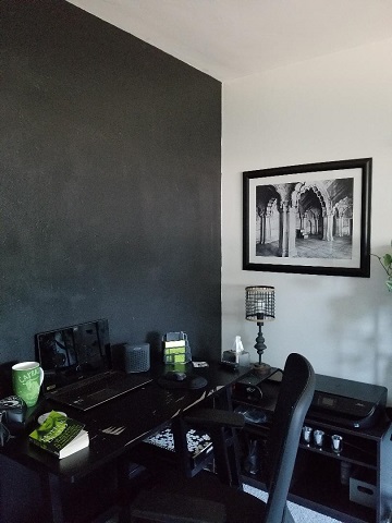 My desk remains to the left of the door. I’m still madly in love with my black wall. It’s calming and centering, and its space-like expanse nurtures my creativity.